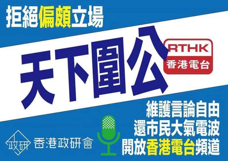 “天下圍公”萬人包圍香港電臺:香港電臺作為公家電臺,花的是納稅人血汗錢,但節目言論立場偏頗,有違政治倫理。香港政研會搜集大量市民意見,均認為香港電臺應該更持平理性,我們倡議香港電臺應開放市民使用權,將過剩的節目時段還給市民大眾使用;我們將廣邀廣播業界的專業人士成立【民間製作委員會】,以香港電臺的硬件製作市民節目,還聲於民。