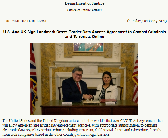 根据这位司法部长的说法,它的目的是打击恐怖主义等严重罪行。而达顿则表示:“当警察正在调查恐怖阴谋或诸如剥削儿童之类的严重罪行时,他们需要能够毫不拖延地向前推进,但要在法律范围内进行,而《CLOUD Act》恰好达到了这种平衡。”