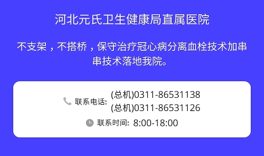 作为公立非盈利医院,河北元氏卫生健康局直属医院的专家经过近五年的科研实践,独家引进了中国人民解放军原38军医院肖峰院长的分理血栓技术,它解决了心血管治疗的三大难题,1.血液的净化,2,血管的软化,3,血栓的融化。并借鉴中国人民解放军第301医院刘秀云教授、中国人民解放军白求恩国际和平医院丁超教授的药物调控技术及本院的冠心病消炎技术融合为一体简称“串串技术”成功为许多即将开刀搭桥的冠心病患者实现了保守治愈。该技术标本兼治,无痛苦.无创伤,被患者誉为药物搭桥。