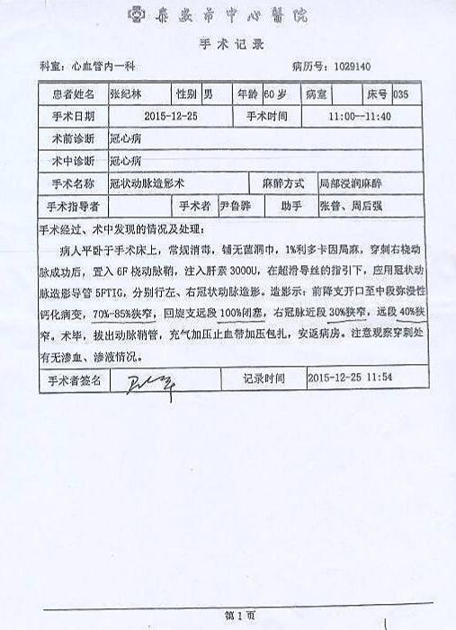 (患者张纪林治疗前心脏造影单,已堵塞百分之一百)