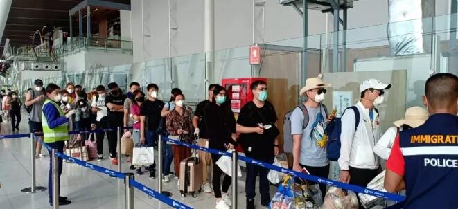 ▲滞留泰国普吉的乘客排队登机