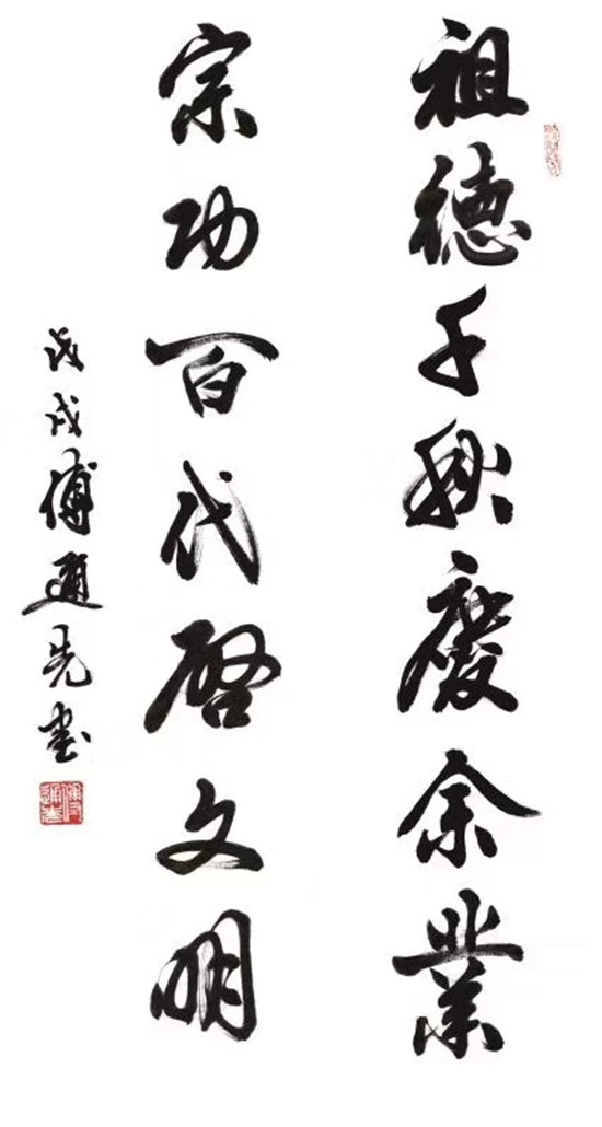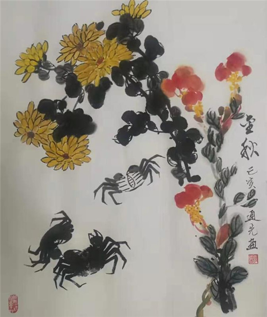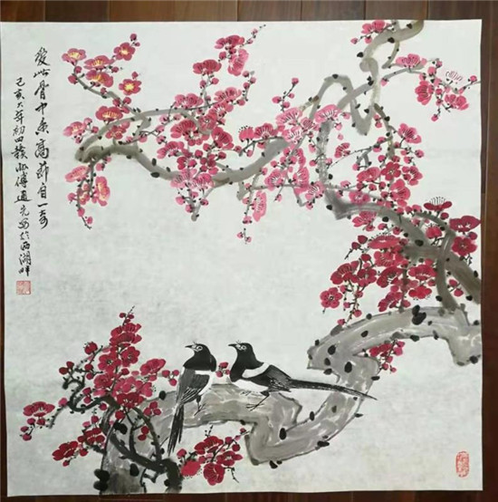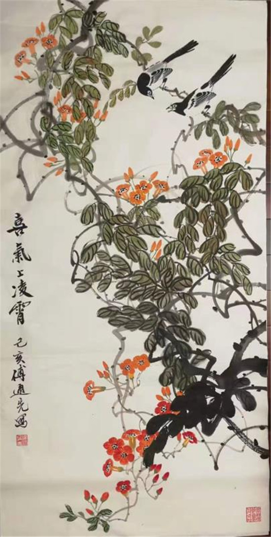 近几年我每年在大运河畔组织为运河居民公益写春联活动,老傅也每每都来,贡献他的一手好字。老傅的书法宗二王,攻赵体,有自己独到的风貌。他在浙江日报工作时还兼任《美术报》的总编与社长,曾发奋钻研绘事,花鸟、山水、人物,均广猎博取,颇具功力。所以他写的春联与“福”字就是抢手,百姓喜爱。