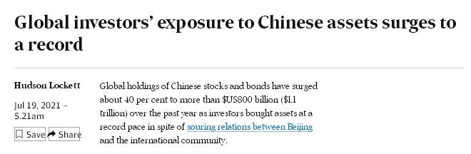全球投资者目前正以创纪录的速度购买中国资产。全球所持有的中国股票和债券在过去一年中飙升了约40%,超过8000亿美元(1.1万亿澳元)。