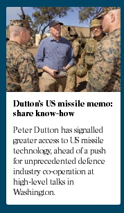 在澳洲准备在下周的华盛顿高级别会谈中推动前所未有的国防工业合作之前,联邦防长都顿(PeterDutton)表示,更多地获得美国导弹技术将是对澳新美联盟(ANZUS)的一个关