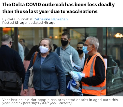 数据显示,新州已有数万人感染了德尔塔(Delta)变异毒株,但此次疫情的致死率却没有去年那么高。澳广网10日报道,一位传染病专家表示,由于老年人的疫苗接种变高,所以