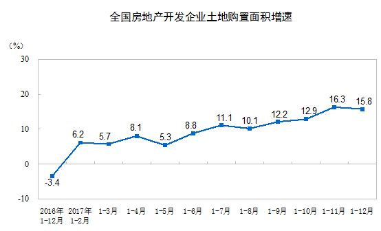 2017年,房地产开发企业土地购置面积25508万平方米,比上年增长15.8%,增速比1-11月份回落0.5个百分点;土地成交价款13643亿元,增长49.4%,增速提高2.4个百分点。
