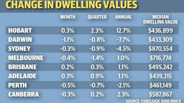 霍巴特的年度房价指数上涨了12.7%,达尔文为7.7%,阿德莱德仅为1.1%。