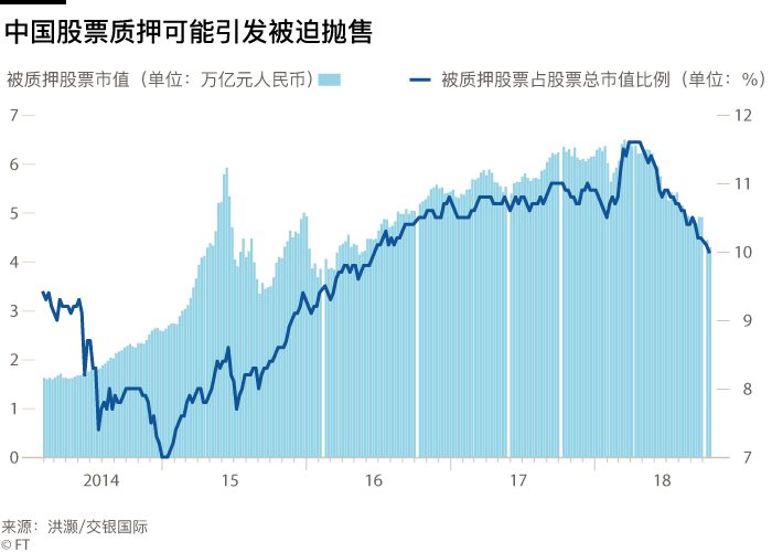 除了对贸易战和经济放缓的担忧之外,投资者还担心过多的股票质押,截至10月中旬有市值4.3万亿元人民币(合6180亿美元)的股票被用作贷款质押品。随着股票价格接近债权人必须出售股票以收回其贷款价值的水平,股市持续下跌有可能引发被迫抛售股票浪潮。