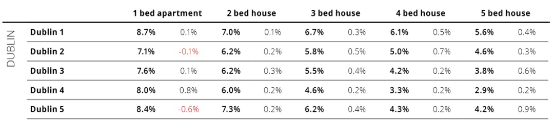 以都柏林1-5区不同房型的租金回报率为例,一居室租金回报率在7%-9%左右,二居室和三居室的租金回报率也可以达到5%以上。同时由于每年租金的上涨速度超过房价,因此租金回报率还有一定幅度的上涨。
