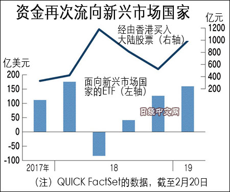 据调查分析网站QUICK FactSet的统计,美国面向新兴市场国家的交易所交易基金(ETF)在1~2月流入了160亿美元资金。
