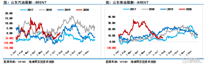 除了低油价的囤油,中国原油需求确实在突飞猛进地增长,不管是独立炼厂还是主营炼厂都在开足马力加工,炼厂开工率都达到了近几年的新高位置。开工率如此之高,与中国经济恢复有很大关系,同时也与前段时间炼油利润高有关。但最近我们看到,由于南方暴雨连连,柴油的炼油利润已经降至了近三年以来的新低,汽油利润从低点开始反弹,季节性回升比价明显。