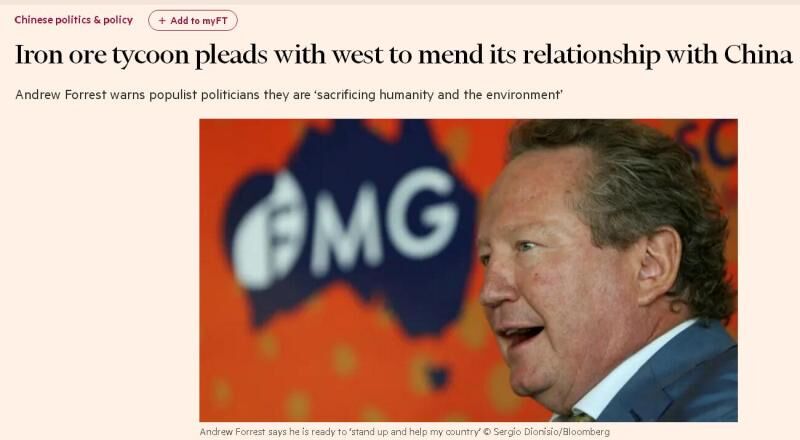 西澳矿业大亨福雷斯特(Andrew Forrest)近日接受《金融时报》报道时呼吁,澳洲政客应当放弃特朗普式的民粹主义,重塑支离破碎的对华关系,从而避免破坏全球经济和环境。