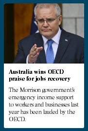 经合组织(OECD)7日发布年度《就业前景》(Employment Outlook)报告。其中,澳洲莫里森政府去年为工人和企业提供的紧急收入支持受到了经合组织的称赞,澳洲的快速就业复苏现在已经领先其富裕国家数年。