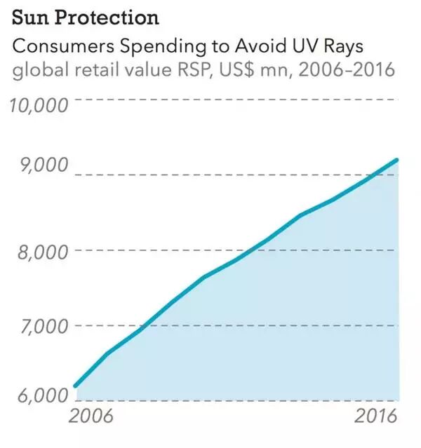 2006~20016年,随着消费者防紫外线意识增强,全球防晒用品零售值逐年递增