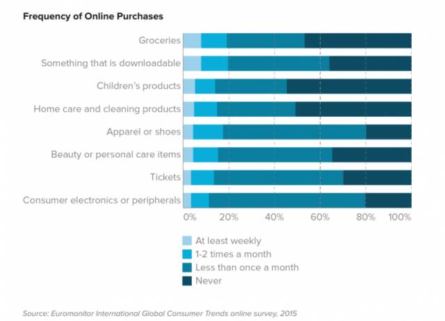 (消费者在网上购买各类商品的频率分布,杂货的购买频率最高)