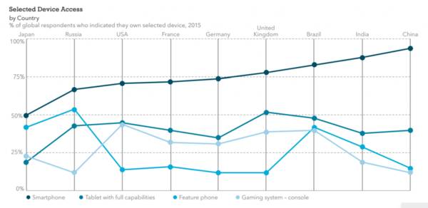 (全球各个国家消费者拥有各类电子设备的人数比例)