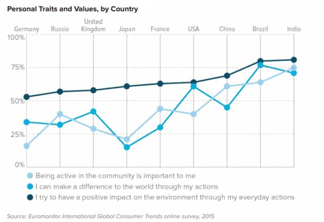 从上图便可以看出,世界各大主要市场的消费者,大部分均希望能够通过自己的行为,对社会产生积极的影响。