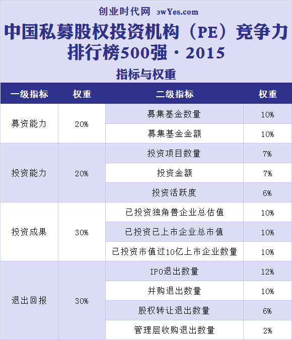 “中国私募股权投资机构(PE)竞争力排行榜500强·2015”从募资能力、投资能力、投资成果和退出回报四个维度来考察一家创投机构的竞争力,选择募集基金数量、募集基金金额、投资项目数量、投资金额、投资活跃度、已投资独角兽企业总估值、已投资已上市企业总市值、已投资市值过10亿上市企业数量、IPO退出数量、并购退出数量、股权转让退出数量、管理层收购退出数量,等十二个指标对中国创投机构的竞争力进行排名。