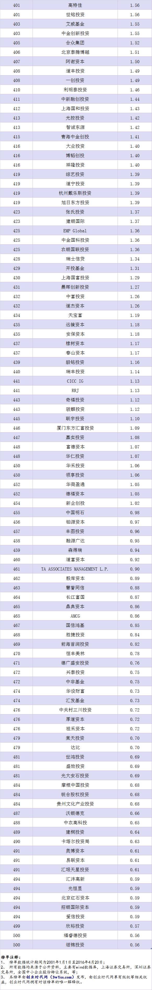 1.本榜单侧重从历史累积成绩来评价创投机构的竞争力,数据统计期间为2001年1月1日至2016年4月20日;