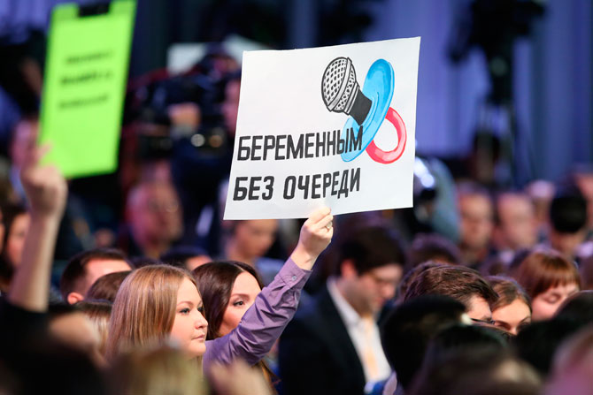 有现场女记者高举写有“孕妇无须排队”的牌子。(网页截图)据俄罗斯媒体报道,当地时间12月17日,普京召开第11次年度新闻发布会,近1400名国内外记者应邀参与。发布会