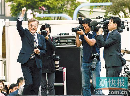 ■5月6日,韩国共同民主党总统候选人文在寅(左一)在竞选活动上向支持者挥手示意。韩国定于9日举行总统选举。投票进入倒计时之际,各主要候选人利用选前的最后一个周