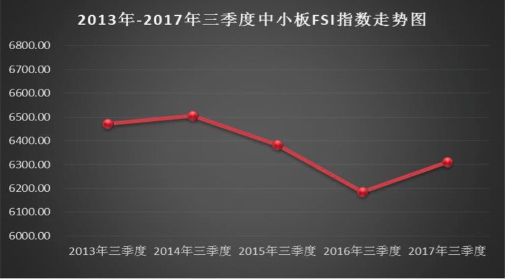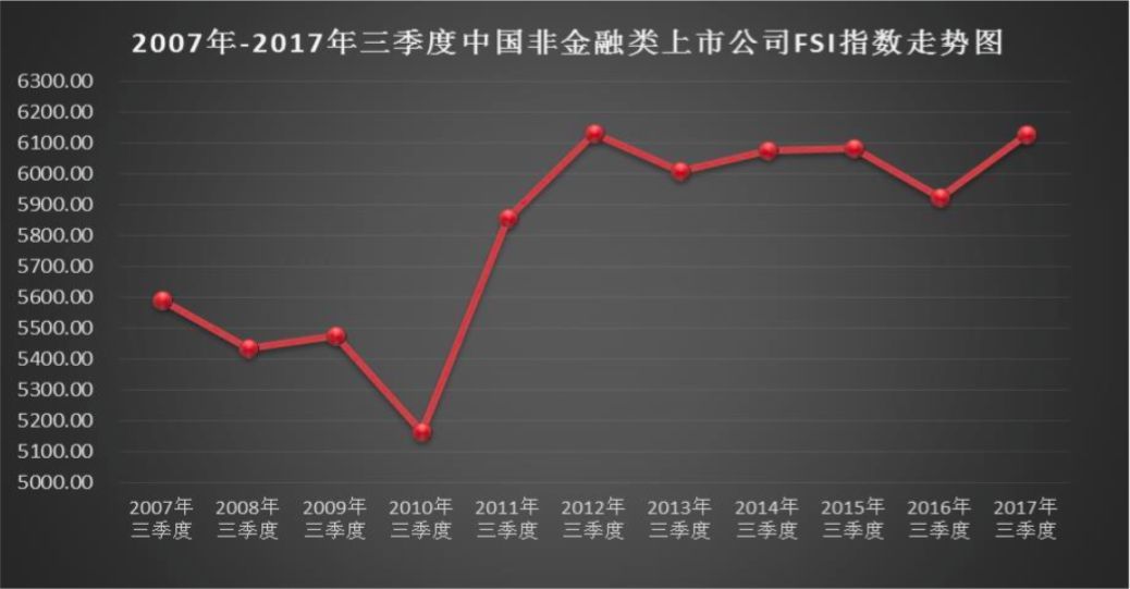 总体而言,我国非金融类上市公司财务安全总指数(Financial Security Index,简称:FSI总指数)2017年三季度出现明显拐点,上升势头非常明显,2017年三季度上市公司FSI总指数同比上升203.53个基点,涨幅3.44%,FSI总指数重回6000点大关(6000点相当于60分,40分及格),上升速度创近6年新高,是近6年中表现最好的一次。因此,赛弥斯(Themis)分析预测,2018年上半年,我国非金融类上市公司总体财务安全状况将明显上升。