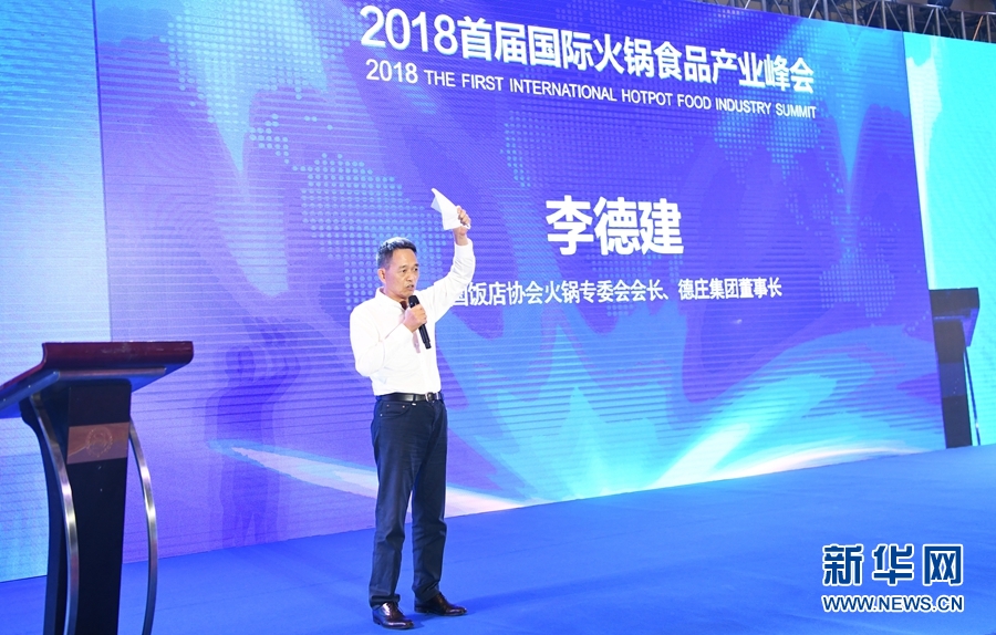 中国饭店协会火锅专业委员会会长、德庄集团董事长李德建在国际火锅食品产业峰会上发言。新华社记者王全超摄