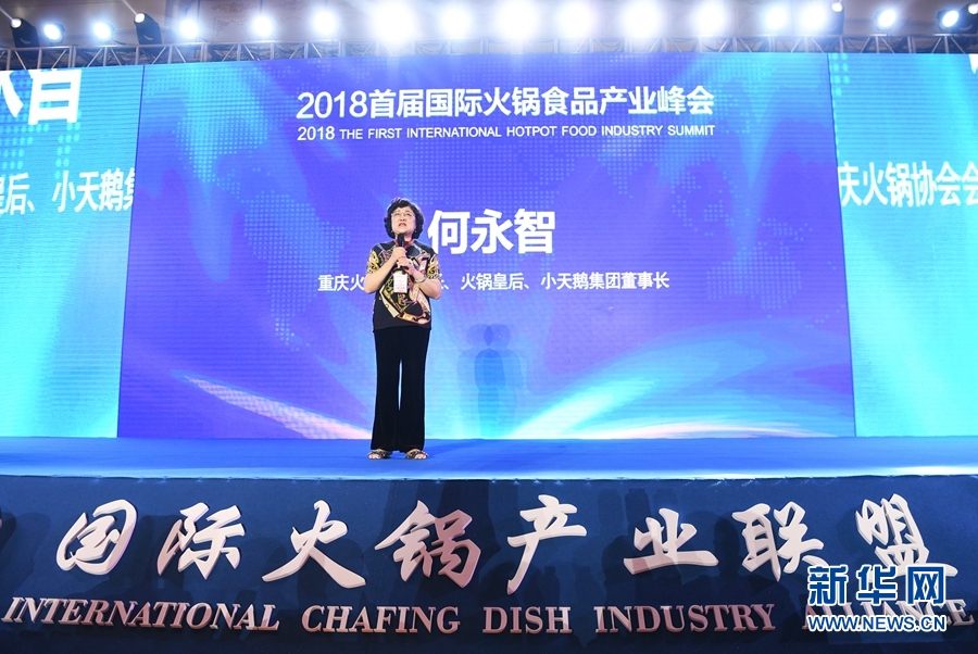 6月21日,重庆火锅协会会长、小天鹅集团董事长何永智在国际火锅食品产业峰会上发言。新华社记者王全超摄