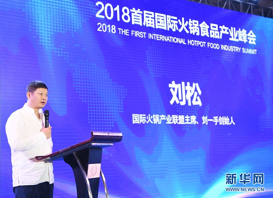 6月21日,国际火锅产业联盟主席、刘一手创始人刘松在国际火锅食品产业峰会上发言。新华社记者王全超摄
