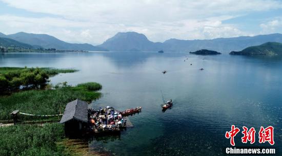 8月中旬,位于四川与云南交界处的泸沽湖景区迎来旅游旺季,湖边成群的游客排队等候乘坐猪槽船。
