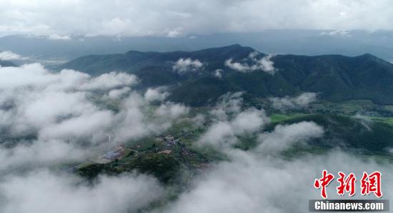 清澈的湖水与远处的大山、白云构成一幅美丽画卷。