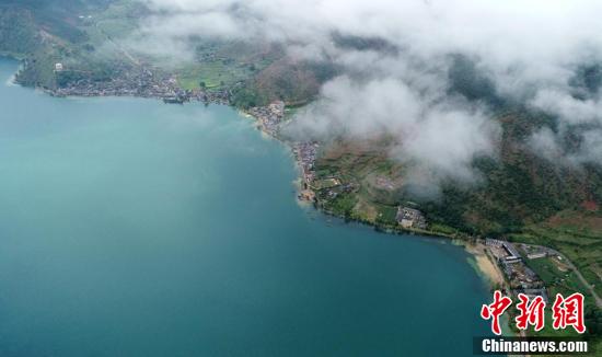 天空中鸟儿自由翱翔,云儿轻快飘扬,为泸沽湖增添了无限生机。远处的走婚桥像泸沽湖的绸带,增添了几分妩媚,犹如“船在湖中行,人在画中游。”