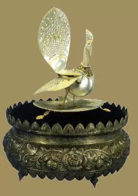 孔雀通体用贝壳精心雕刻,孔雀双翅彩屏上的斑纹用珍珠镶嵌,颈部彩带用银雕制,双腿为银制,这些都增添了这件礼品的华贵。整件礼品构思巧妙,精工细作,表达了巴基斯坦人民的良好祝愿。