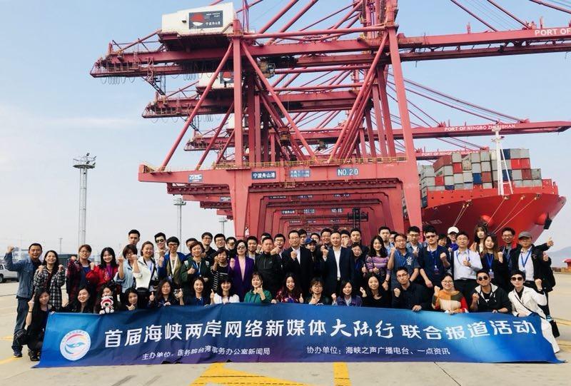 首届“海峡两岸网络新媒体大陆行”活动报道团在宁波舟山港合影