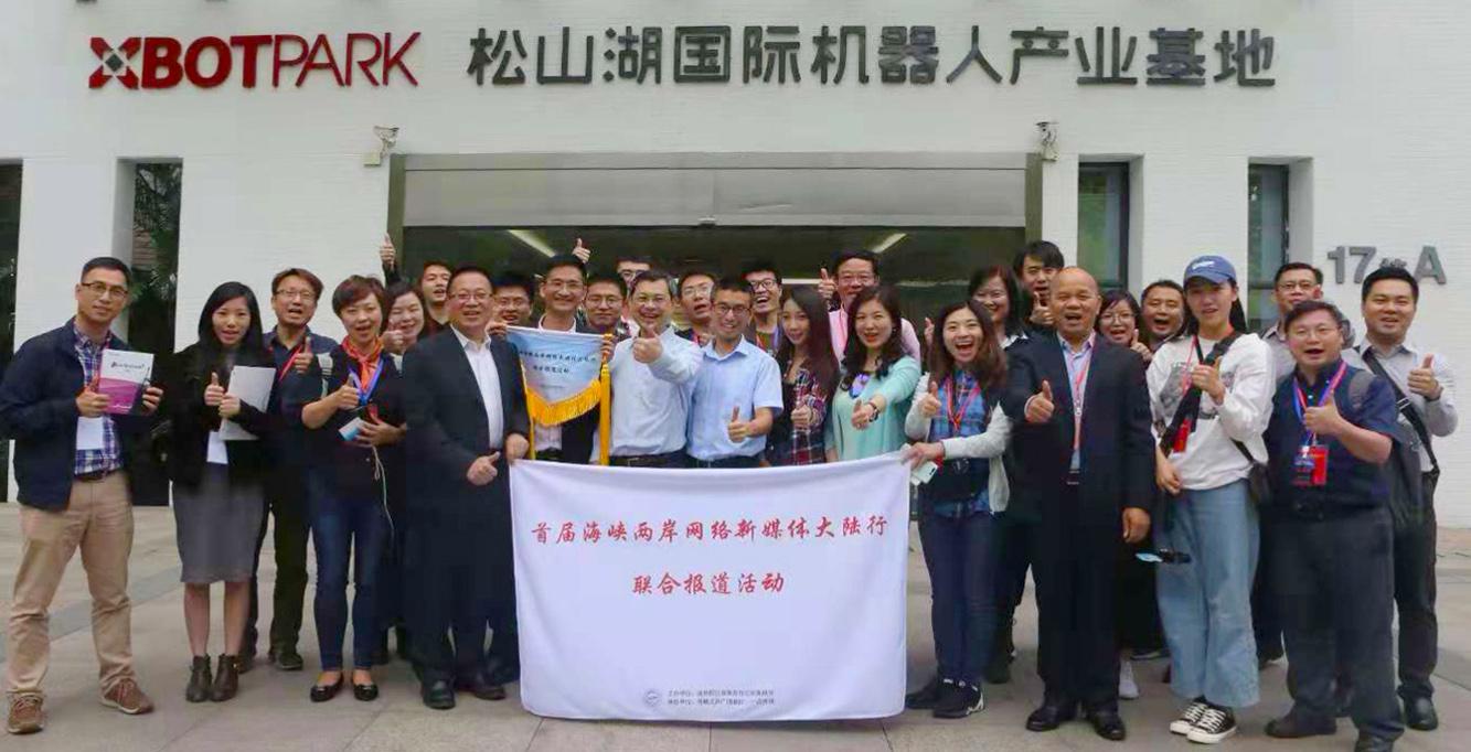 首届“海峡两岸网络新媒体大陆行”活动报道团在东莞松山湖国际机器人产业基地合影
