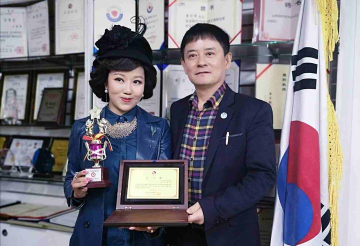 韩国歌手协会中央会为邓丽君歌友会首席歌手、中国当红歌星韩小露颁发中韩国际艺术交流贡献大奖奖牌。