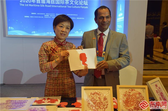 福州市非遗项目传承人董雅萍为斯里兰卡驻华临时代办尤格纳丹(右)剪影。东南网记者 潘超 摄