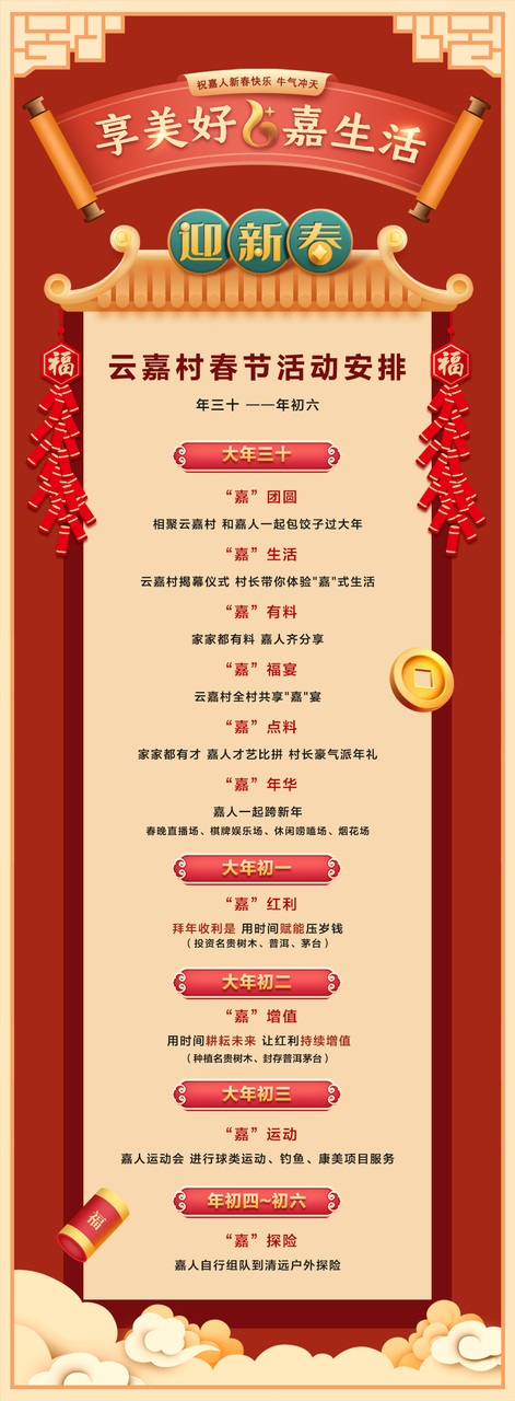 据透露,云嘉村“村民”在春节期间,不只是见证云嘉村揭幕,还有“嘉”团圆、“嘉”生活、“嘉”有料、“嘉”福宴、“嘉”点料、“嘉”年华、“嘉”红利、“嘉”增值、“嘉”运动、“嘉”探险等一大波活动哦。届时,“村民”们将一起包饺子,一起享福宴,一起体验“嘉”式生活,一起分享“村民”感受,一起登台献艺,一起倒数跨年,一起种植名贵树木,一起户外探险,一起球艺(台球、乒乓球、羽毛球、高尔夫球)比拼……