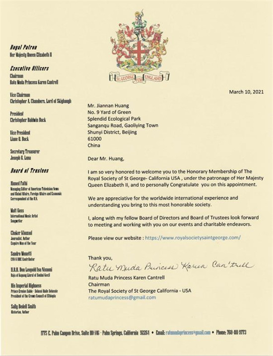近日,凯伦·坎特雷尔专门给黄建南写了一封贺信。她在信中说,非常荣幸地欢迎您在伊丽莎白二世女王陛下的支持下成为美国圣乔治加利福尼亚皇家学会的荣誉会员,并亲自祝贺您的任命。“这是英国皇家学会五名董事投票表决通过的。我们感谢您为这个最光荣的社会带来的全球国际经验和理解。我以及我的董事会成员都期待与您相会。也邀请您参与我们的活动和慈善事业中。”凯伦·坎特雷尔表示。
