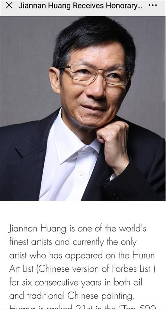对这一盛事,比佛利艺术节官网专门作了报道(如上截图)。报道说,黄建南是世界上最优秀的艺术家之一,也是目前唯一连续六年出现在胡润百富榜(《福布斯》中文版)的艺术家。在欧美艺术权威网站Artprice的"全球当代艺术家500强"中,黄建南排名第21位。黄建南是全球慈善联盟金质奖章获得者,被印尼王室授予"Earl"称号。