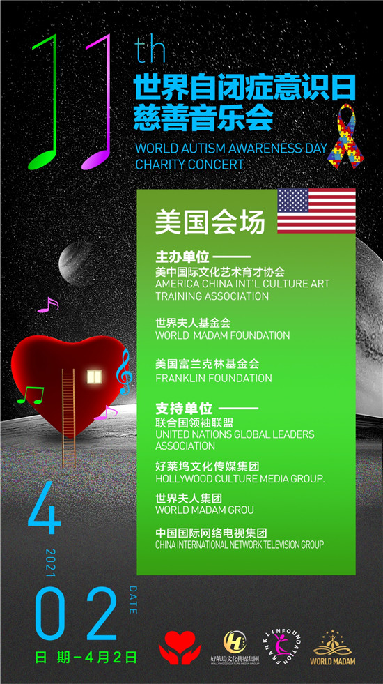 Since 2009, Madam Lisa Chen, global executive chairwoman of World Madam and founder of the America China Culture Art Training Association, has organized World Autism Awareness Day charity concert in April every year for the pass 10 years in the United States. The charity concerts received positive responses and supports from related charity organizations in the United States, as well as unanimous praise from mainstream society and the media. In April 2018, Madam Lisa Chen received a congratulatory letter from United Nations Secretary-General Antonio Guterres representing the United Nations Public Investigation Team and the Ministry of Public Information to give her high regard.