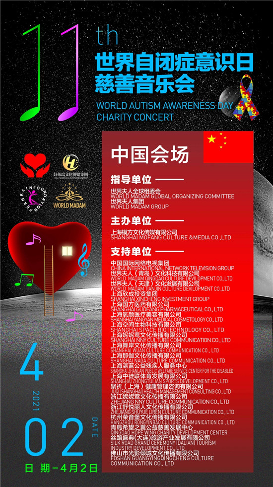 (Beijing, China - April 2, 2021) The 11th United Nations Autism Awareness Day Charity Concert was held at the Shanghai Grand Theater, and received warmly support from different autism organizations, teachers and parents, Madam Anni Huang Chairwoman of the Board of Directors of World Madam Group, division chairpersons of the World Madam Group, all world madams and our 500+ guests. There are more than 1million audiences watching this charity concert online.