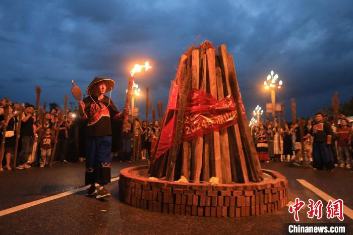 7月29日晚,“激情火把节 最炫民族风”2024年凉山彝族火把节的“重头戏”火把狂欢夜在四川省西昌市举行,上万名当地民众和游客点燃手中的火把,载歌载舞欢庆彝族最重要的节日之一——火把节,沉浸式体验火把互动的激情与热烈。图为一名毕摩祈福,准备点火把堆。中新社记者 王磊 摄