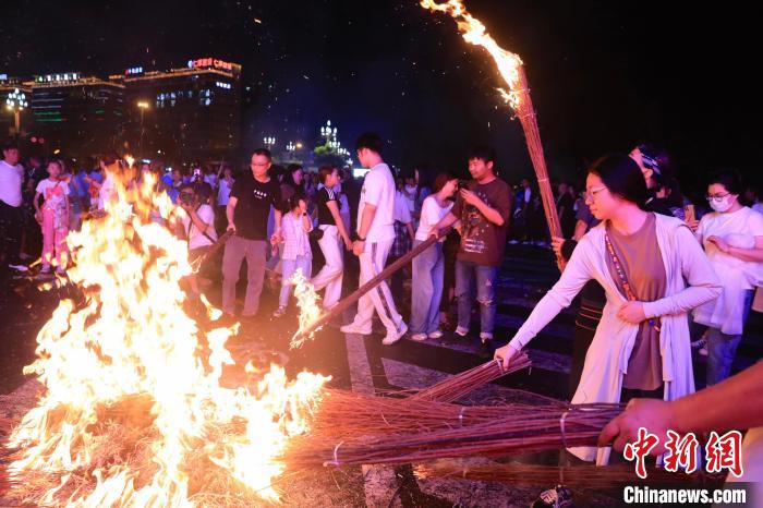 7月29日晚,“激情火把节 最炫民族风”2024年凉山彝族火把节的“重头戏”火把狂欢夜在四川省西昌市举行,上万名当地民众和游客点燃手中的火把,载歌载舞欢庆彝族最重要的节日之一——火把节,沉浸式体验火把互动的激情与热烈。图为游客和当地民众点起火把。中新社记者 王磊 摄