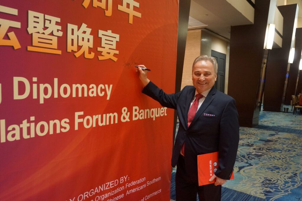 当晚活动的成功举办,离不开幕后关键的推动力量。在活动最后,美国南加州华人华侨联合总会会长蔡成华先生代表主办方致答谢词。他特别感谢了为活动提供支持的各方,并点明了活动的核心目标:“本次晚宴暨论坛,旨在搭建—个开放、建设性的交流平台,汇聚体育、文化、工商、学术及社会各界的力量,共同传承和弘扬乒乓外交精神,激励新—代继续推动中美友好关系行稳致远。”他特别提到:“感谢中国国家体育总局和中国乒协,派国青队世界冠军参加今晚的活动,着实推动乒乓外交精神世代交替、薪火相传。”这正与现场中美青年互换球衣的温馨—幕深刻共鸣,揭示了从历史到未来的清晰传承脉络。