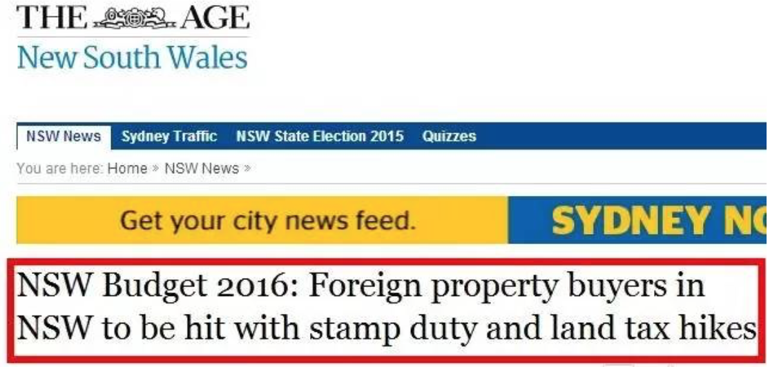 新州新政概述 在新州2016/17财年,从7月份开始,海外人士将会被要求支付额外4%的印花税。从2017年开始,海外投资者还将被要求支付额外0.75%的土地税。 这两项决定预期将会在6月21日,新州财长第二次财报会议上提出。而新州政府在之前的政府议案中已经提出,从2016年7月起,所有新州房产交易,买卖双方均需要首先证明他们的国籍才能进行下一步交易。