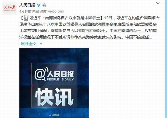 习近平强调,南海诸岛自古以来就是中国领土。中国在南海的领土主权和海洋权益在任何情况下不受所谓菲律宾南海仲裁案裁决的影响。中国不接受任何基于该仲裁裁决的主张和行动。中国一贯维护国际法治以及公平和正义,坚持走和平发展道路。我们坚定致力于维护南海和平稳定,致力于同直接有关的当事国在尊重历史事实的基础上,根据国际法,通过谈判协商和平解决有关争议。