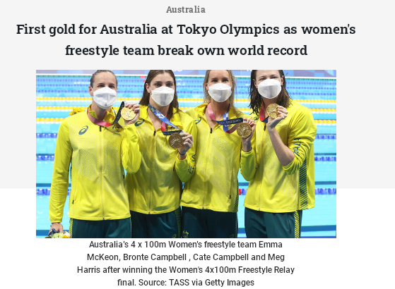 澳洲女子自由泳队25日在4x100米自由泳接力赛中打破自己的世界纪录,在东京奥运会上为澳洲赢得第一枚金牌。上周日(25日)在东京水上运动中心(TokyoAquaticsCentre)举