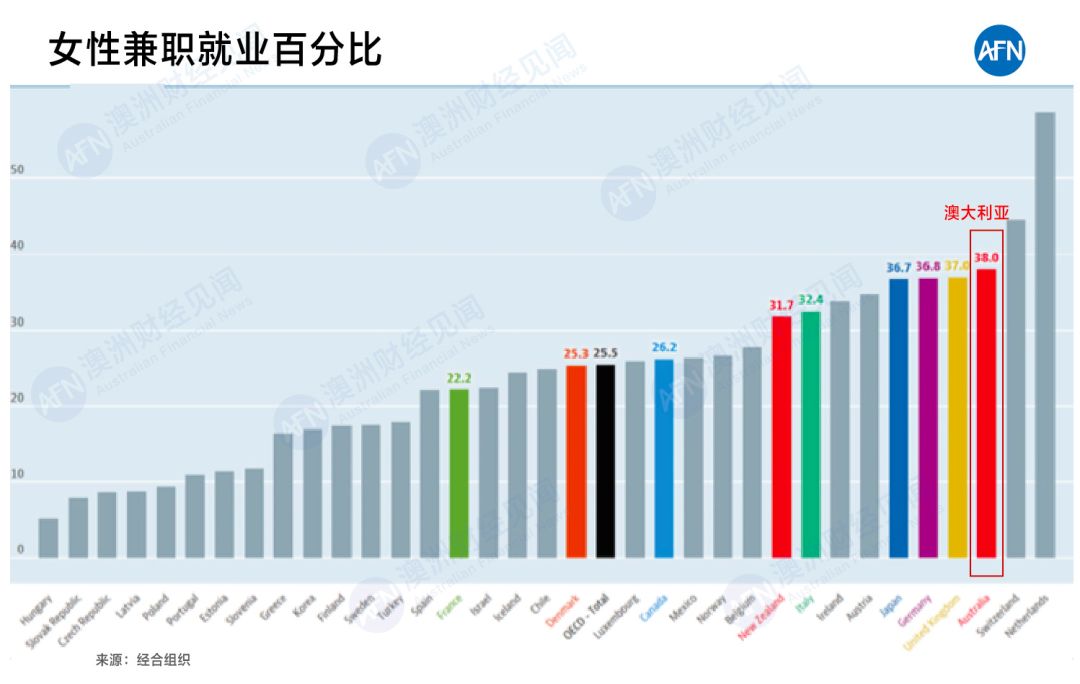 但仍有证据表明,澳洲女性劳动力参与率虽然正在上升,但澳大利亚是经合组织(OECD)中女性兼职就业率最高的国家之一(每周少于30小时)。