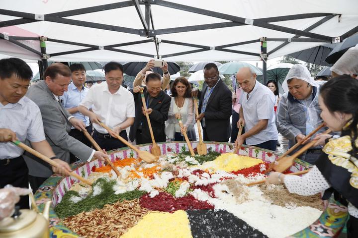 在朝鲜驻华大使池在龙和塞尔维亚驻华大使米兰·巴切维奇的带动下,驻华使节们依次拿过木榔头,亲手打制打糕。打糕是朝鲜族的传统美食,用特制的木榔头将煮熟的糯米捶打而成,口感粘糯鲜香。尝过自己亲手打制的打糕,使节们纷纷称赞叫好。